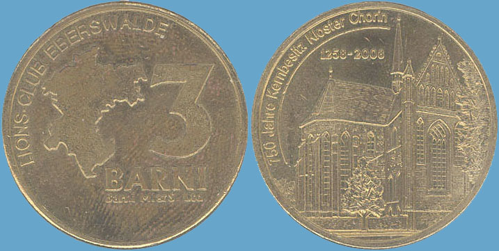 3 Barni; 2008; ausgegeben: 2008/07; Herausgeber: Lions-Club; MB-3Barni-2008-06; Vs.: 3 BARNI - Lions-Club Eberswalde; Rs.: 750 Jahre Kernbesitz Kloster Chorin; Messing Goldfarbig; Dm=30,22mm; Auflage: 1.000 Stück; Spendenbarni |
