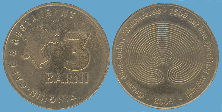 3 Barni; 2009; ausgegeben: 2009/03; Herausgeber: Pinguin-Cafe & Restaurant; MB-3Barni-2009-01; Vs.: 3 Barni - Pinguin-Cafe & Restaurant; Rs.: Erster Eberswalder Wunderkeis-1609 auf dem Hausberg angelegt; Stahlkern vermessingt; Dm=30,22mm |