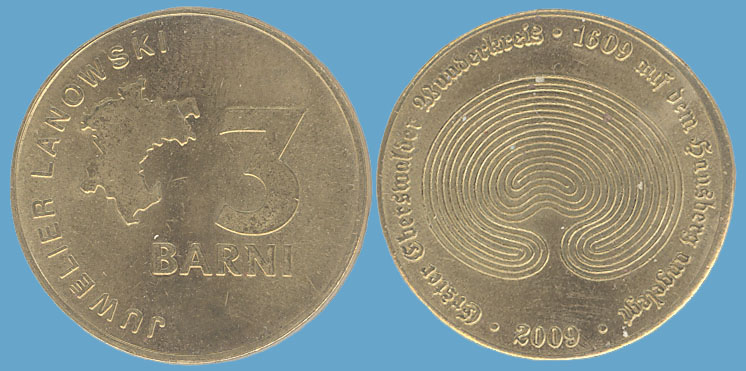 3 Barni; 2009; ausgegeben: 2009/03; Herausgeber: Juwelier & Goldschmiede Lanowski; MB-3Barni-2009-02; Vs.: 3 Barni - Juwelier & Goldschmiede Lanowski; Rs.: Erster Eberswalder Wunderkeis-1609 auf dem Hausberg angelegt; Messing Goldfarbig; Dm=30,22mm |