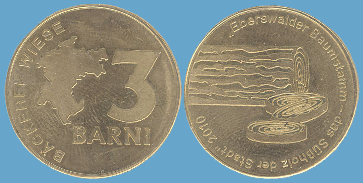 3 Barni; 2010; ausgegeben: 2010/10; Herausgeber: Bäckerei Wiese; MB-3Barni-2010-02; Vs.: 3 Barni - Bäckerei Wiese; Rs.: Eberswalder Baumstamm-das Süßholz der Stadt; Messing Goldfarbig; Dm=30,22mm |