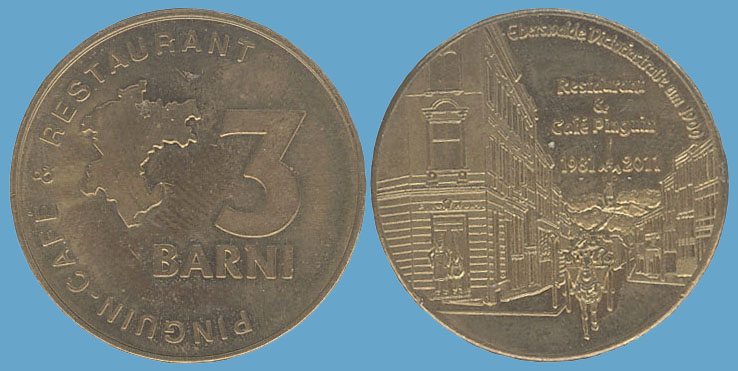 3 Barni; 2011; ausgegeben: 2011/03; Herausgeber: Pinguin-Cafe & Restaurant; MB-3Barni-2011-02; Vs.: 3 Barni - Pinguin-Cafe & Restaurant; Rs.: Eberswalder Victoristraße um 1900 Restaurant & Cafe Pinguin 1981-2011; Messing Goldfarbig; Dm=30,22mm |