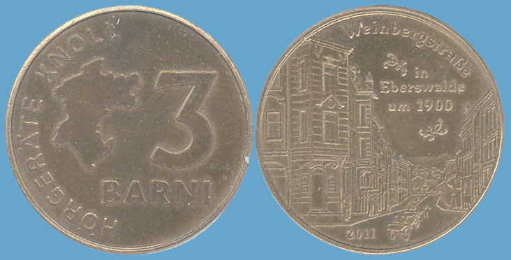 3 Barni; 2011; ausgegeben: 2011/01; Herausgeber: Musahl exklusiv; MB-3Barni-2011-01; Vs.: 3 Barni - Musahl exklusiv; Rs.: Eberswalder Wappen seit 1993; Messing Goldfarbig; Dm=30,22mm |