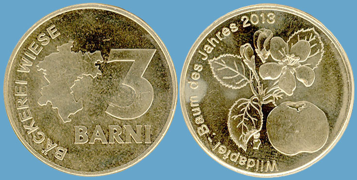 3 Barni; 2013; ausgegeben: 2013/09; Herausgeber: Bäckerei Wiese; MB-3Barni-2013-01; Vs.: 3 Barni - Bäckerei Wiese; Rs.: Wildapfel – Baum des Jahres 2013; Messing Goldfarbig; Dm=30,22mm |