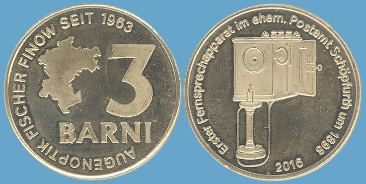 3 Barni; 2016; ausgegeben: 2016/01; Herausgeber: Augenoptik Fischer; MB-3Barni-2016-01; Vs.: 3 Barni - Augenoptik Fischer; Rs.: Erster Fernsprechapparat im ehem. Postamt Schöpfurth um 1898; Messing Goldfarbig; Dm=30,22mm |