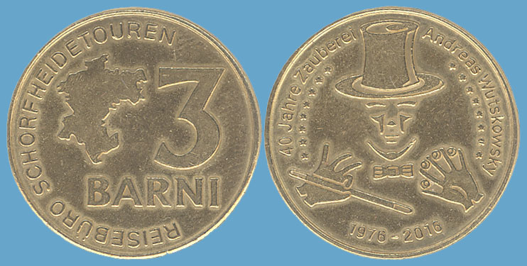 3 Barni; 2016; ausgegeben: 2016/03; Herausgeber: Reisebüro Schorfheide Touren; MB-3Barni-2016-03; Vs.: 3 Barni - Reisebüro Schorfheide Touren; Rs.: 40 Jahre Zauberei A. Wutskowsky 1976-2016; Messing Goldfarbig; Dm=30,22mm |