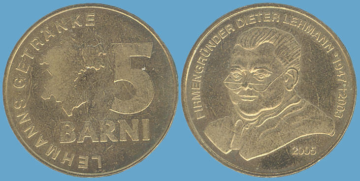 5 Barni; 2005; ausgegeben: 2005/01; Herausgeber: Lehmanns Getränke; MB-5Barni-2005-01; Vs.: 5 Barni - Lehmanns Getränke Eberswalde; Rs.: Firmengründer Dieter Lehmann 1947-2003; Messing, Goldfarbig; Dm=30,22mm; Zeichnung: Dorina Andress |