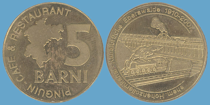 5 Barni; 2007; ausgegeben: 2007/09; Herausgeber: Pinguin-Cafe & Restaurant; MB-5Barni-2007-01; Vs.: 5 Barni - Pinguin-Cafe & Restaurant; Rs.: ehem. Hohenzollernkanal, Kanalbrücke Eberswalde 1910; Messing, Goldfarbig; Dm=30,22mm |