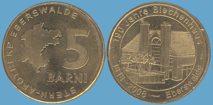 5 Barni; 2009; ausgegeben: 2009/06; Herausgeber: BARNI Marketing & Service Ltd.; MB-5Barni-2009-01; Vs.: 5 Barni - BARNI Marketing & Service Ltd.; Rs.: Eberswalder Rathaus auf dem Marktplatz 1701-1825; Messing, Goldfarbig; Dm=30,22mm; Spendenbarni |