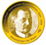 5 Barni; 2012; ausgegeben: 2012/06; Herausgeber: Verein für Heimatkunde zu Eberswalde e.V.; MB-5Barni-2012-02; Vs.: 5 Barni - Verein für Heimatkunde zu Eberswalde e.V.; Rs.: Spendenbarni 2012 – Ernst Hopf, Eberswalder Bürgermeister 1895-1928; Messing, Goldfarbig; Dm=30,22mm; Spendenbarni |