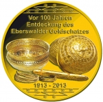 5 Barni; 2013; ausgegeben: 2013/05; Herausgeber: Verein für Heimatkunde zu Eberswalde e.V.; MB-5Barni-2013-01; Vs.: 5 Barni - Verein für Heimatkunde zu Eberswalde e.V.; Rs.: Vor 100 Jahren Entdeckung des Eberswalder Goldschatzes; Messing, Goldfarbig; Dm=30,22mm; Spendenbarni |