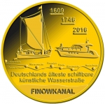 5 Barni; 2016; ausgegeben: 2016/06; Herausgeber: BARNI Marketing & Service Ltd.; MB-5Barni-2016-01; Vs.: 5 Barni - Barni M. & S. Ltd.; Rs.: Deutschlands älteste schiffbare künstliche Wasserstraße FINOWKANAL; Messing, Goldfarbig; Dm=30,22mm; Spendenbarni |