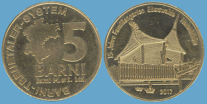 5 Barni; 2017; ausgegeben: 2017/06; Herausgeber: BARNI Marketing & Service Ltd.; MB-5Barni-2017-01; Vs.: 5 BARNI - Barni M. & S. Ltd.; Rs.: 15 Jahre Familiengarten Eberswalde; Messing goldfarbig; Dm=30,22mm; Spendenbarni |