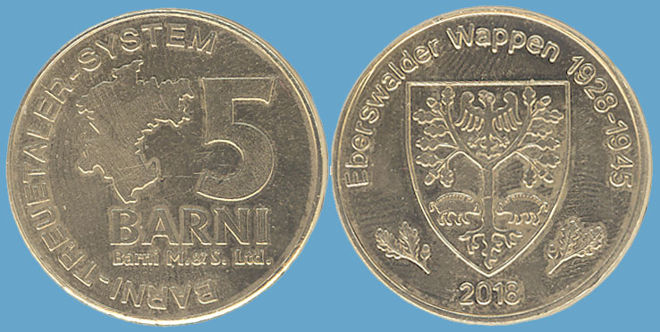5 Barni; 2018; ausgegeben: 2018/06; Herausgeber: BARNI Marketing & Service Ltd.; MB-5Barni-2018-01; Vs.: 1 BARNI - Barni M. & S. Ltd.; Rs.: Eberswalder Wappen 1928-1945; Messing, Goldfarbig; Dm=30,22mm; Spendenbarni |