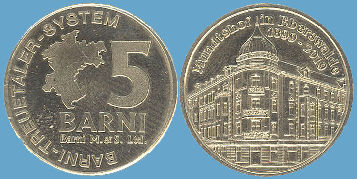 5 Barni; 2019; ausgegeben: 2019/06; Herausgeber: BARNI Marketing & Service Ltd.; MB-5Barni-2019-01; Vs.: 5 Barni - Barni M. & S. Ltd.; Rs.: Mundtshof in Eberswalde 1899-2019; Messing, Goldfarbig; Dm=30,22mm Spendenbarni |