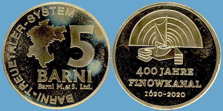 5 Barni; 2020; ausgegeben: 2020/01; Herausgeber: BARNI Marketing & Service Ltd.; MB-5Barni-2020-01; Vs.: 5 Barni - Barni M. & S. Ltd.; Rs.: 400 JAHRE FINOWKANAL 1620-2020; Messing, Goldfarbig; Dm=30,22mm Spendenbarni |
