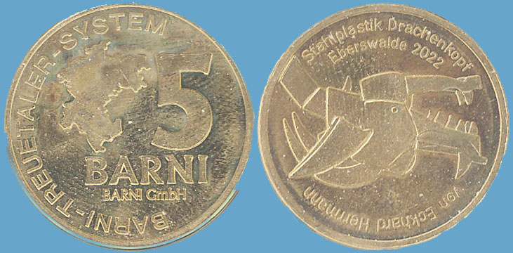 5 Barni; 2021; ausgegeben: 2022/12; Herausgeber: BARNI Marketing & Service Ltd.; MB-5Barni-2022-01; Vs.: 5 Barni - Barni M. & S. Ltd.; Rs.: Stahlplastik Drachenkopf / von Eckhard Herrmann / Eberswalde 2022; Messing, Goldfarbig; Dm=30,22mm Spendenbarni |