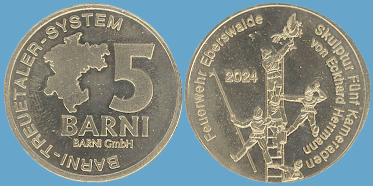 5 Barni; 2024; ausgegeben: 2024/06; Herausgeber: BARNI Marketing & Service Ltd.; MB-5Barni-2024-01; Vs.: 5 Barni - Barni M. & S. Ltd.; Rs.: Feuerwehr Eberswalde 2024 / Skulptur fünf Kameraden / von Eckhard Herrmann; Messing, Goldfarbig; Dm=30,22mm Spendenbarni |