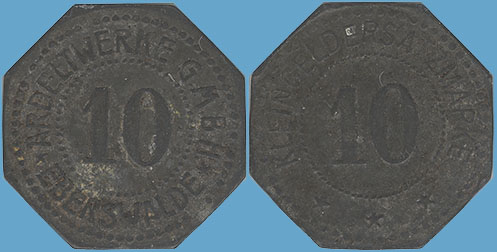 10 Pfennige; o. J., 1917; Hasselmann 296.4; Vs.: ARDELTWERKE G.M.B.H. * EBERSWALDE * um Wertzahl; Rs.: KLEINGELDERSATZMARKE; Zink; Dm=20,8mm 8eckig; Prägung bei Christian Lauer in Nürnberg |