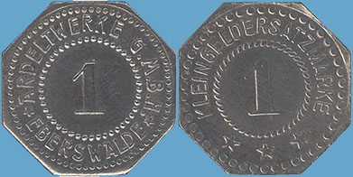 1 Pfennig; o. J., 1917; Hasselmann 296.1; Vs.: ARDELTWERKE G.M.B.H. * EBERSWALDE * um Wertzahl; Rs.: KLEINGELDERSATZMARKE; Zink; Dm=16,5mm 8eckig; Prägung bei Christian Lauer in Nürnberg |