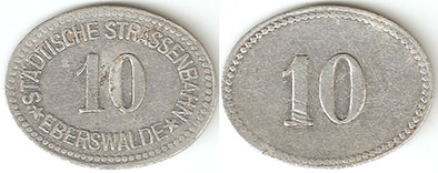 10 Pfennig; o. J.; Numismatische Hefte 3 - Eberswalde 19.; Vs.: STÄDTISCHE STRASSENBAHN * EBERSWALDE* um Wertzahl; Rs.: Wertzahl; Eisen; Dm= 24,2 x 18,5mm queroval |