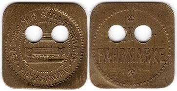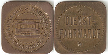 o.W.; o.J.; Menzel 7620.3; Vs.: STÄDTISCHE STRASSENBAHN * EBERSWALDE* um Straßenbahnwagen; Rs.: DIENST-FAHRMARKE; Messing; Dm= 22,2 x 22,2mm quadratisch, Ecken gerundet; mittig gelocht 4,5mm; Gewicht: 3,5g |