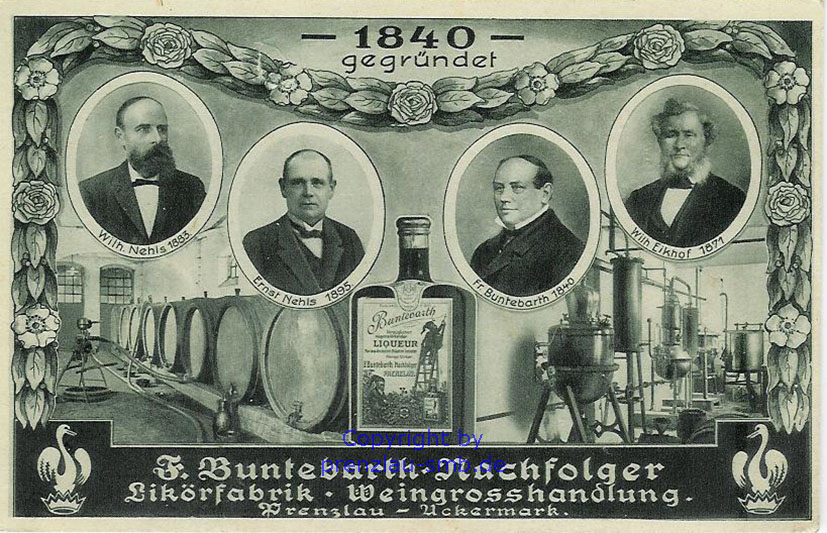 Geschichtliches • Buntebarth - Liqueur ![]() • Firmengründer Buntebarth, Friedrich (geb. am 16.3.1814 in Cremmen; gest. 4.7.1876 in Prenzlau) eröffnete 1840 sein Geschäft in der Friedrichstraße 203 (bis 1871) • von 1871 bis 1883 führte das Geschäft Wilhelm Eickhoff ![]() • von 1883 bis 1895 führte das Geschäft Wilhelm Nehls • von 1895 bis 1899 übernahm das Geschäft Ernst Nehls (Sohn von Wilhelm Nehls) • 1899 kaufte Ernst Nehls das Grundstück 320/21 in der Baustraße und führte dort das Geschäft bis 1931 • von 1931 bis 1945 führte das Geschäft in der Baustraße Ernst Nehls jun. (Sohn des Ernst Nehls) • verkauft wurde der Buntebarth-Liqueur u.a. in der Stettiner Straße 2 ![]() • 1945 brannten die Gebäude in der Baustraße ab • 1946 baute Karl Nehls (Bruder von Ernst Nehls jun.) das Geschäft in der Baustraße wieder auf und führte es bis 1952 weiter ![]() Quellen: • Adreßbücher der Stadt Prenzlau in mehreren Jahrgängen • "Die Prenzlauer Straßen und ihre Geschichte", Alfred Hinrichs, maschinenschriftliche Aufzeichnungen, 1954 • "Mitteldeutsche Familienkunde", Ausg. 7, 1982, S. 251 • "Stadtgeschichte und Daten über Prenzlau", 1985-1989 (maschinenschriftlich) |