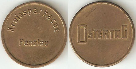 o. W.; o. J.; nicht katalogisiert; Vs.: umlaufend: Kreissparkasse, unten Prenzlau; Rs.: mittig: OSTERTAG; Messing; Dm=27,0mm |