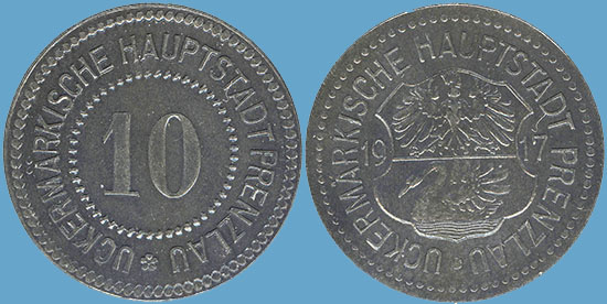 10 Pfennig 1917; Funck 431.2c; Menzel 26139.2; 1. Bedarfsgeld in Prenzlau; Zink; Dm = 23,0mm; Gewicht: 2,81 Gramm; Auflage 50.000 Stück; Vs. und Rs.: umlaufend: UCEKRMÄRKISCHE HAUPTSTADT PRENZLAU; Variante U - U 3,5mm; Prägefirma: L. Chr. Lauer, Nürnberg |