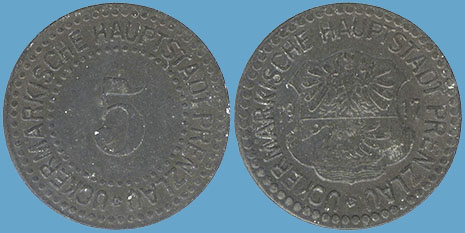 5 Pfennig 1917; Jäger / Funck 431.1; Menzel 26139.1; 1. Bedarfsgeld in Prenzlau; Zink; Dm = 19,2mm; Gewicht: 1,65 Gramm; Auflage 100.000 Stück; Vs. und Rs.: umlaufend: UCEKRMÄRKISCHE HAUPTSTADT PRENZLAU; Prägefirma: L. Chr. Lauer, Nürnberg |