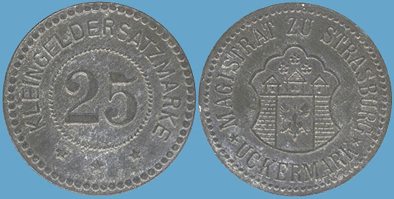25 Pfennig o. J.; Funck 524.1a; Vs.: Wappen; Rs.: Wertziffer und umlaufend: KLEINGELDERSATZMARKE; Zink; Dm=24,0mm; Gewicht: 3,20 Gramm; 2 in 25 mit geradem Fuß |