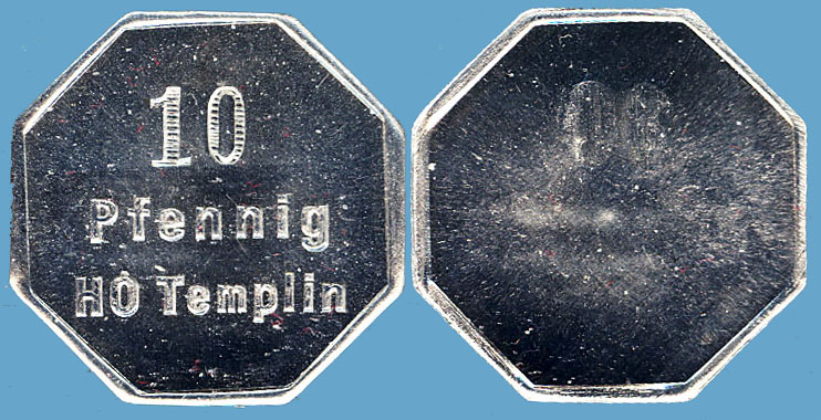 10 Pfennig o. J.; Menzel 13208.2; Vs.: erhaben geprägter Rand; "10" eingeschlagen; "Pfennig" und darunter "HO Templin" erhaben geprägt; Rs.: leer; Aluminium; Gewicht: 2,26 Gramm; 30,2mm 8eckig |