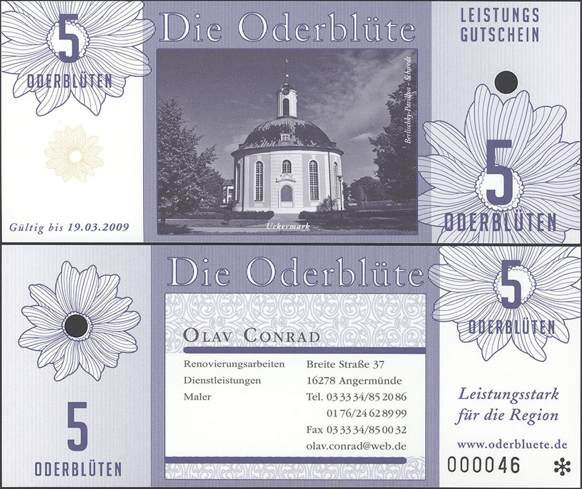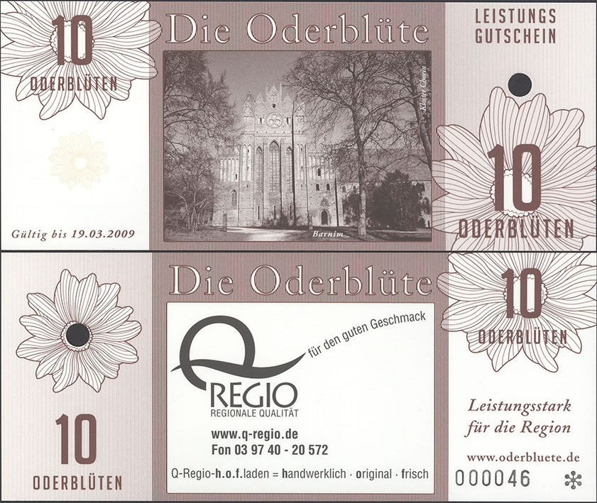 100 Oderblüten; erschienen 2007; nicht katalogisiert; Vs.: Schloss Criewen, gültig bis19.3.2009; Rs.: WZ. 6-stellig und dahinter ein 6-zackiger Stern; ohne Wz.; Graublau; lochentwertet; gedruckt auf Robuskin PE; Druckerei: Wippold, Schwedt |