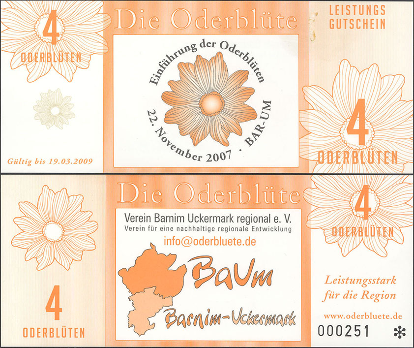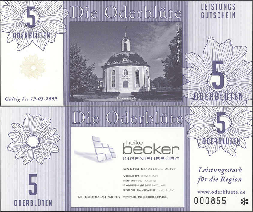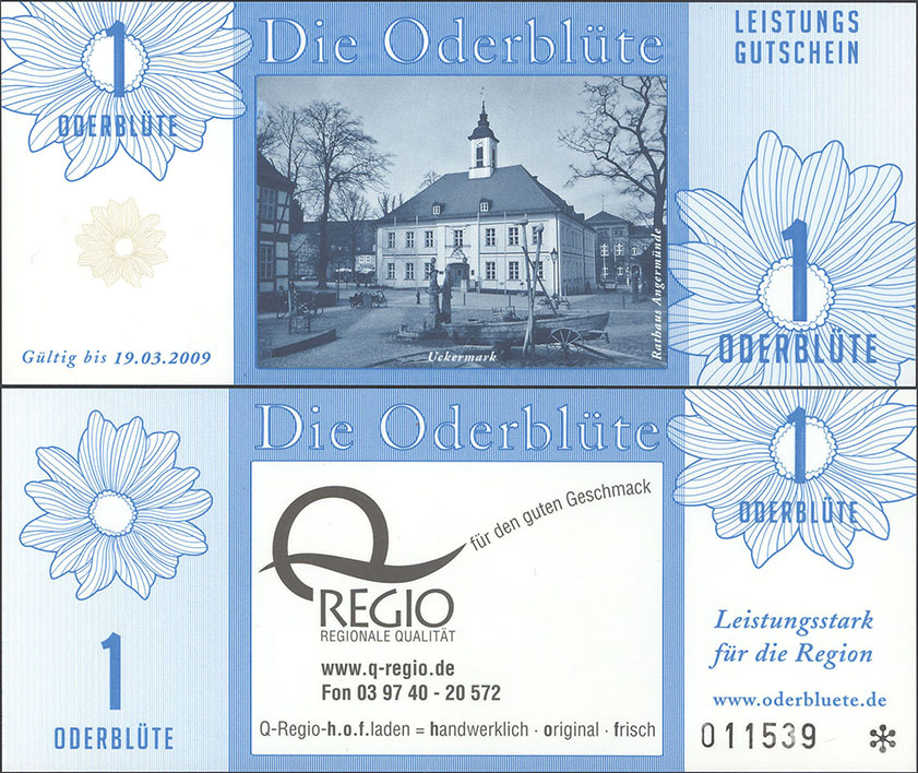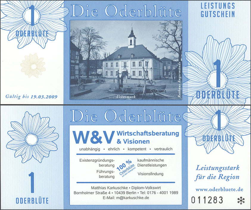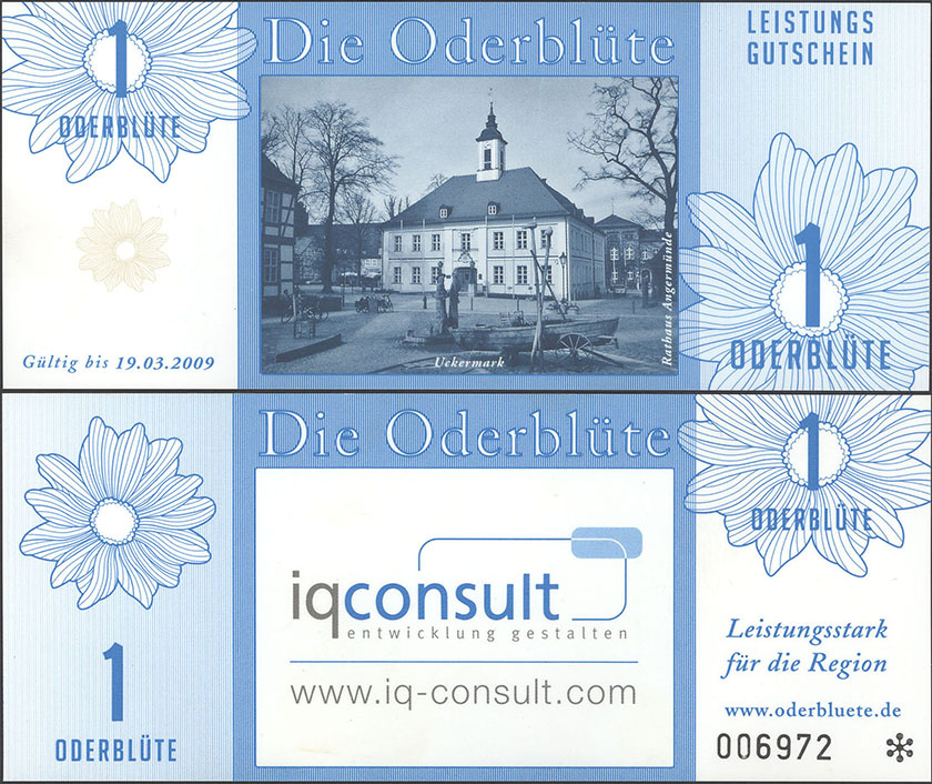 1 Oderblüte; erschienen 2008; Lange OD01.1; Vs.: Rathaus Angermünde, gültig bis19.3.2009; Rs.: WZ. 6-stellig und dahinter ein 6-zackiger Stern; ohne Wz.; Hellblau; gedruckt auf Robuskin PE; Druckerei: Wippold, Schwedt |