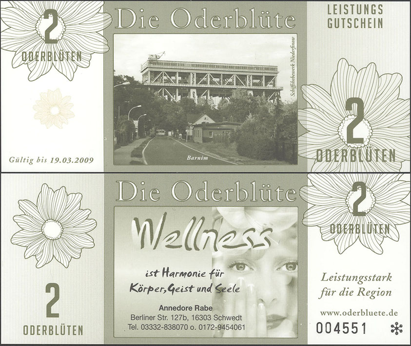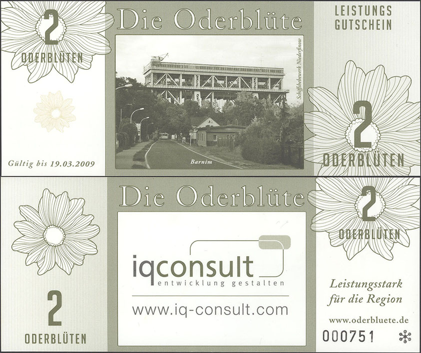 2 Oderblüten; erschienen 2008; Lange OD01.2; Vs.: Schiffshebewerk Finow, gültig bis19.3.2009; Rs.: WZ. 6-stellig und dahinter ein 6-zackiger Stern; ohne Wz.; Khakigrün; gedruckt auf Robuskin PE; Druckerei: Wippold, Schwedt |