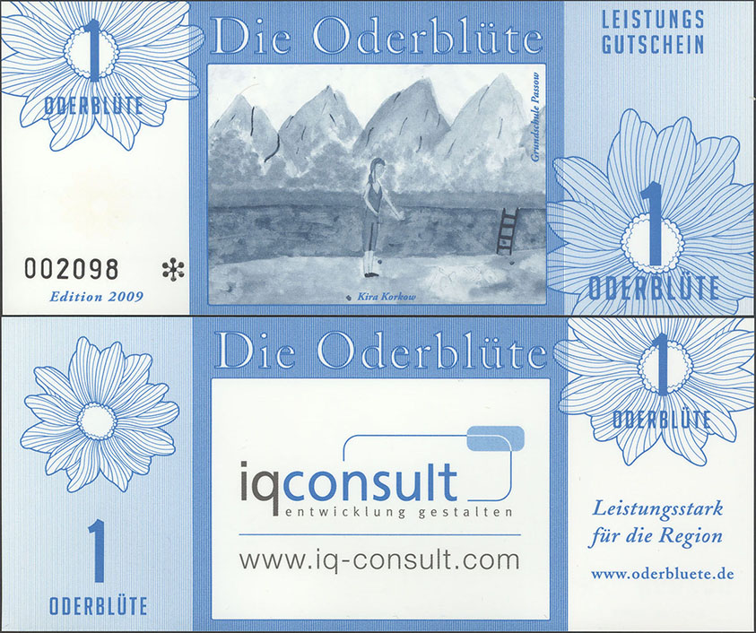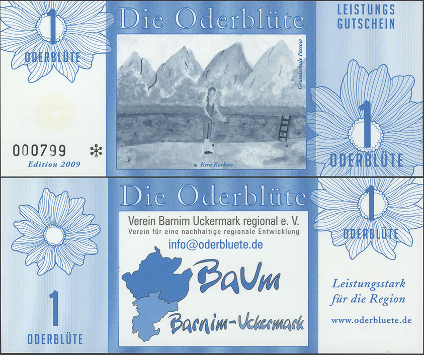 1 Oderblüte; erschienen 2009; Lange OD02.1; Vs.: Schülerzeichnung, Grundschule Passow; Rs.: WZ. 6-stellig und dahinter ein 6-zackiger Stern; ohne Wz.; Hellblau; gedruckt auf Robuskin PE; Druckerei: Wippold, Schwedt; Auflage: 500 Stück; Herausgeber: Wirtschaftsring Barnim-Uckermark; Graphik: Phillip Blöcker; Design: Thomas Krause |
