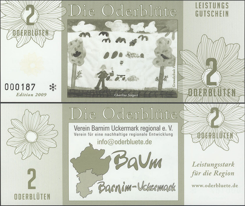 2 Oderblüten; erschienen 2009; Lange OD02.2; Vs.: Schülerzeichnung, Grundschule Passow; Rs.: WZ. 6-stellig und dahinter ein 6-zackiger Stern; ohne Wz.; Khakigrün; gedruckt auf Robuskin PE; Druckerei: Wippold, Schwedt; Auflage: 300 Stück; Herausgeber: Wirtschaftsring Barnim-Uckermark; Graphik: Phillip Blöcker; Design: Thomas Krause |