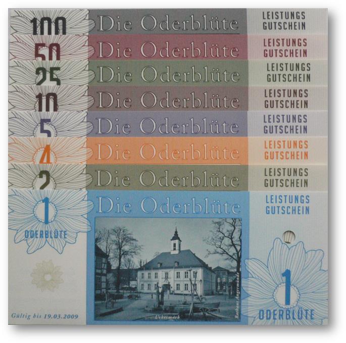 Ein weiterer Entwurf der zu sehen war. Hier nannte man es ODERBLÜTE, mit dessen Namen man sich in Schwedt und nähere Umgebung bestimmt identifizieren könnte. Bundesfreund Th. Krause interessierte sich besonders für diesen Ausstellungsteil. Er sagte prompt zur Ausstellerin, Heike Becker „….warum man so ein Spielgeld herstellen möchte….“ Eine kurze Ausführung seitens der Ausstellerin gab uns ausreichend Informationen. Weiterhin meinte Bundesfreund Th. Krause, er könnte das besser und sicherer gestalten, so trat er in den Verein Wirtschaftsring Barnim-Uckermark e.G.i.G. bei, um den Mitgliedern bei der Gestaltung der Gutscheine behilflich zu sein. Nach mehreren Sitzungen im neuen Verein, wurde dann über das Design der neuen Gutscheine beraten. Erklärt wurde, das man kleine Werte nehmen solle und vielleicht Größe und Farben, derer Geldscheine der ehemaligen DDR. Somit hätte man hier wahrscheinlich eine Change und gewissen Wiedererkennungswert, um mit neuem Geld zu Punkten. Aber die Ziele des Vereines waren andere: 1. das Geld sollte in der Uckermark und gleichzeitig im Barnim umlaufen 2. man wolle Nominale von 1-100 ausgeben 3. es solle eine Parität von 1:2 haben Bundesfreund Th. Krause kümmerte sich nicht weiter um die ideologischen Dinge des Vereines und fuhr nach Berlin in ein Grafikstudio zu Phillip Blöcker. Dort ließ er am Computer seine Ideen grafisch umsetzen, weil im persönlich dazu die Möglichkeiten fehlten. Das Endprodukt brachte er mit nach Schwedt und man war begeistert. So wurden einige Sicherheitsmerkmale in das Design integriert, denn Banknoten bzw. Gutscheine benötigen eine gewisse Fälschungssicherheit. So entstand eine Kleinserie Gutscheine namens ODERBLÜTE. In der Schwedter Druckerei Andreas Wippold wurden letzte Vorbereitungen getroffen. Man einigte sich auf das polymerisch reißfeste Material Robuskin. Robuskin PE vereint die Bedruckbarkeit eines gestrichenen Papieres mit den physikalischen Vorteilen einer Kunststoff-Folie und kann überall dort eingesetzt werden, wo Druckwerke extremen Belastungen standhalten müssen. Robuskin PE überzeugt durch hohe Ein- und Weiterreißfestigkeit und durch besondere Stabilität, Witterungs- und Temperatur-beständigkeit (-30°C bis +60°C). Außerdem ist es gegen Wasser, Speichel, Schweiß, sowie Fett und verschiedene Chemikalien beständig. Robuskin PE wird ohne giftige Inhaltsstoffe erzeugt und ist recycelbar. Robuskin PE eignet sich für Werbedrucksachen im Außenbereich, Poster/Plakate, Speisekarten, Eintritts- und Identitätskarten, Stadtpläne, Land- und Seekarten, Wartungsanleitungen, Etiketten aller Art, hochwertige Verpackungen und für viele andere Anwendungen. |