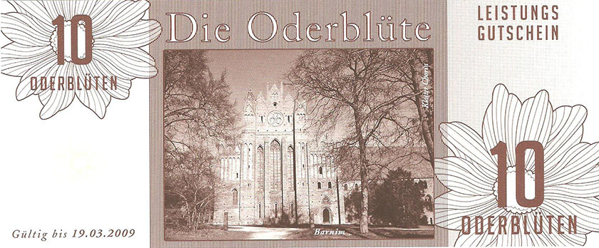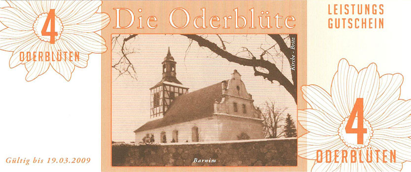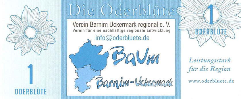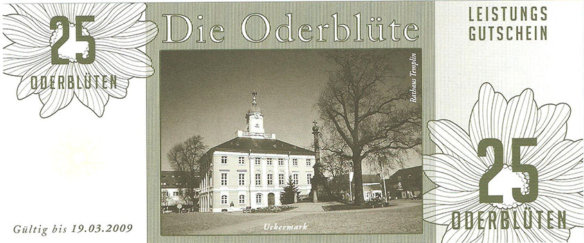 So wurde ein Gutschein zu 25 Oderblüten, als Probedruck, mit dem Abbild des Stolper Turmes mit allen Durchgängen hergestellt und präsentierte ihn dem Verein Wirtschaftsring Barnim-Uckermark e.G.i.G. Nach der Begutachtung hat man sich für den Komplettdruck entschieden. Was nun noch zu klären war, war die Tatsache, welches Nominal welche Grundfarbe haben sollte und welche Motive auf den Gutscheinen zu sehen sein sollte. Die Farben regelten sich nach den Vorlagen der DDR-Mark und die Motive wurden anhand von mehreren Fotos ausgewählt. So bekamen die Gutscheine Farbe und Motiv wie folgt: 1 Oderblüte – Hellbrau – Rathaus Angermünde (Uckermark) 2 Oderblüten – Khakigrün – Schiffshebewerk Finow (Barnim) 4 Oderblüten – Orange – Adomisrose, wurde für Sonderausgaben benutzt 5 Oderblüten – Lila – Berlischky Pavillon ( Uckermark) 10 Oderblüten – Braun – Kloster Chorin (Barnim) 25 Oderblüten – Olivgrün - Rathaus Templin (Uckermark) 50 Oderblüten – Rotbraun – Johanniskirche Eberswalde (Barnim) 100 Oderblüten – Graublau – Schloss Criewen – (Uckermark) Anhand dieser Liste, war schon deutlich dieses Projekt zum Scheitern verurteilt. Warum muss man solche Hohe Werte ausgeben? Sollte man nicht erstmal Klein anfangen ? Und was soll hier eine Parität? Zum anderem war noch die Tatsache zu beklagen, das sehr wenig Pressearbeit geführt wurde, sodass die Bürger nur durch Mundpropaganda davon erfuhren und genau da wurde vieles falsch erklärt und weitergegeben. Man konnte die wenigen interessierten Bürger auch nicht davon überzeugen, bzw. es ihnen glaubhaft erklären. Es kamen noch kleinere Streitereien in den Reihen des Vereins hinzu, sodas dieses Projekt später beendet wurde, ohne richtig gestartet zu sein. Bundesfreund Th. Krause konnte im Namen des Vereines sein Wissen und Können in der ODERBLÜTE einfließen lassen und bedauert, dass die Adonisrose verblüte. |