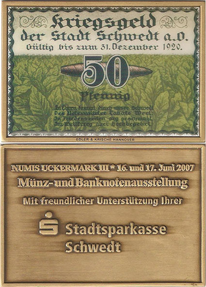 Klippe zur Numis Uckermark III 16. und 17. Juni 2007; Vs.: Schwedter Notgeld; Rs.: gebrägt "NUMIS UCKERMARK III * 16. und 17. Juni 2007 Münz- und Banknotenausstellung Mit freundlicher Unterstützung Ihrer Stadtsparkasse Schwedt"; Bronze geprägt, Foto mit Harz vergossen; Gewicht: 100 g; Hersteller: Geocoin; Entwurf: Thomas Krause, Schwedt; Auflage: 120 Stück |