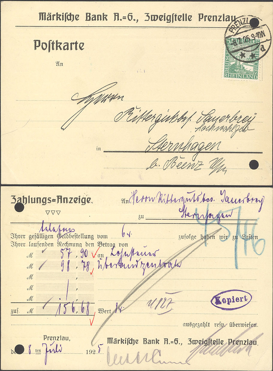 Zahlungs-Anzeige vom 8. Juli 1925 über 156,68 Mark Märkische Bank AG, Zweigstelle Prenzlau |