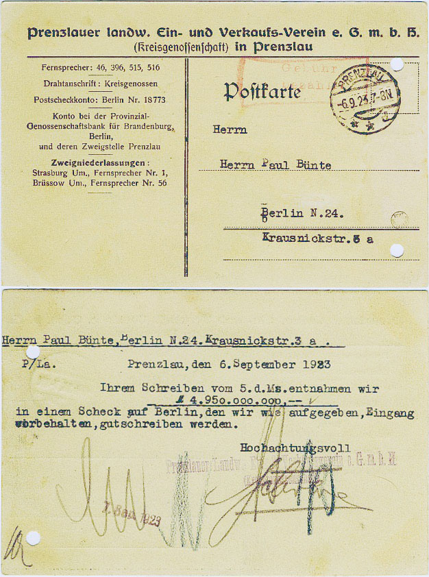 Eingangsbestätigung vom 6. September 1923 über einen Schecks vom 5. September 1923 in Höhe von 4.950.000.000,00 Mark Prenzlauer Landw. Ein- und Verkaufsverein e.G.m.b.H. |