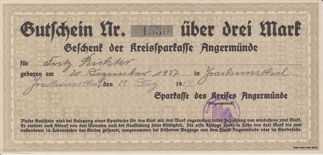 Gutschein über drei Mark Geschenk der Kreissparkasse Angermünde 1927 |