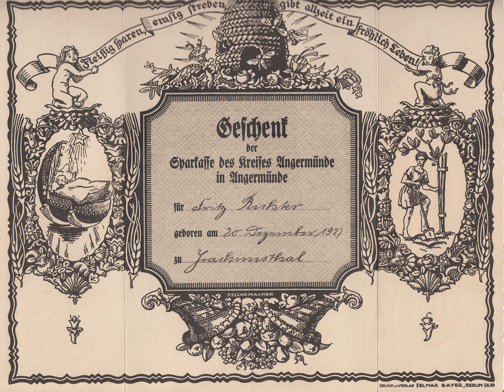 Geschenk dere Sparkasse des Kreises Angermünde 1927 |