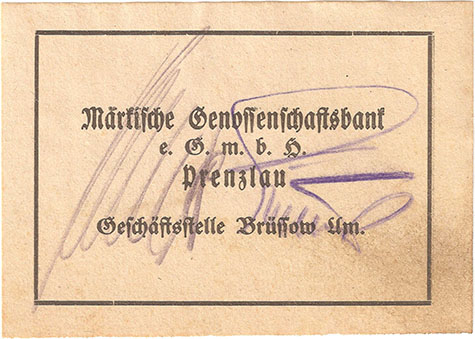 Bankaufkleber Märkische Genossenschaftsbank e.G.m.b.H. Prenzlau Geschäftsstelle Brüssow Um. |