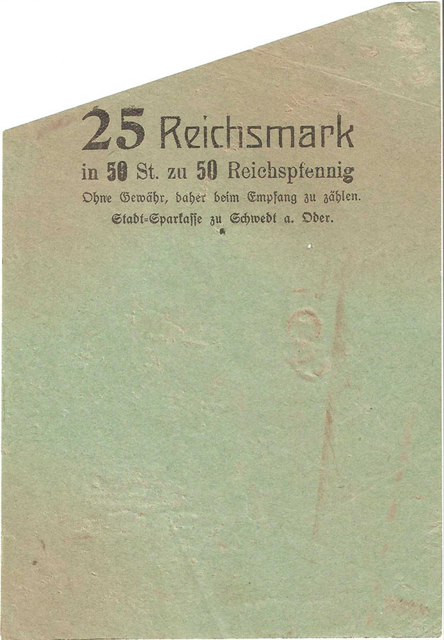 Rollpapier über 25 Reichsmark in Stücken zu 50 Reichspfennig Stadt-Sparkasse zu Schwedt a. Oder |