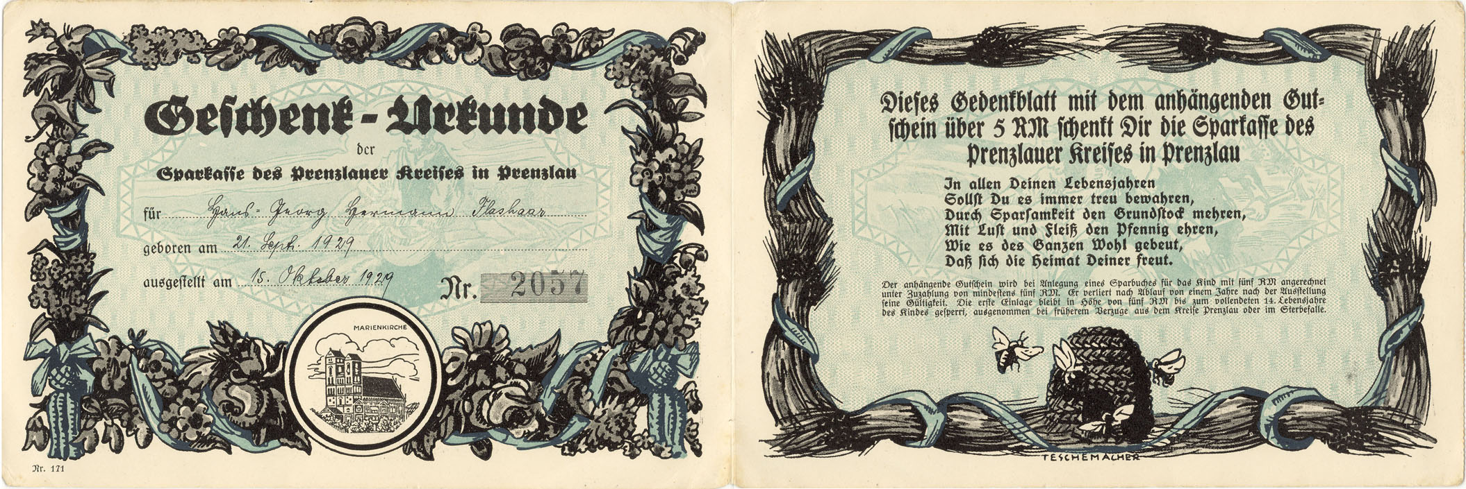 Geschenkurkunde vom 15. Oktober 1929 über 5 Reichsmark der Sparkasse des Prenzlauer Kreises |