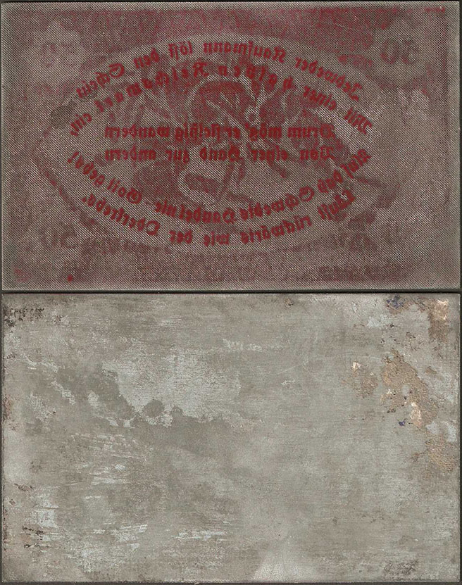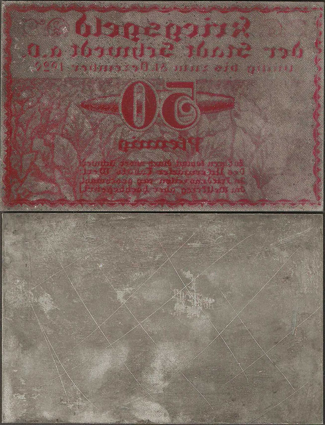 Druckplatte, wurde nach Auskunft der Druckerei Wippold (Schwedt/O.) für Werbe- und Pressezwecke in den 70er Jahren verwendet in der Art der Rs. 50 Pfennig; 01.07.1922; Keller 2337 ![]() |