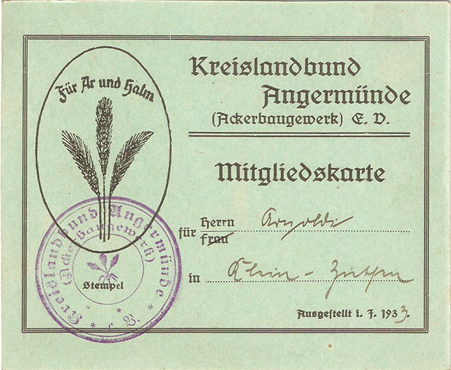 Mitgliedskarte 1933 Kreislandbund Angermünde (gegründet am 19.11.1931) |