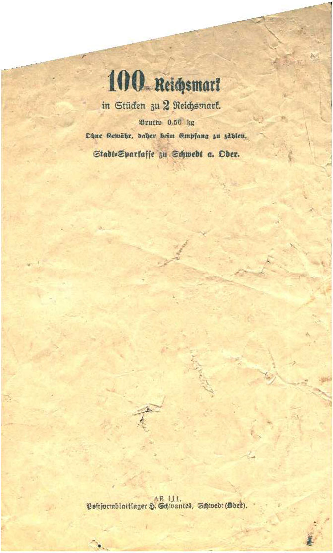 Rollpapier über 100 Reichsmark in Stücken zu 2 Reichsmark Stadt-Sparkasse zu Schwedt a. Oder |